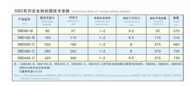 SB、SBD系列液壓安全(緊急)制動(dòng)器,是一種使用在低速軸(卷筒軸)上的大功率制動(dòng)裝置,可廣泛用于大中型起重機(jī)、港口裝卸機(jī)械起升及臂架俯仰機(jī)構(gòu)低速軸的緊急安全制動(dòng)。礦用卷揚(yáng)機(jī)、提升機(jī)和大功率傾角式皮帶運(yùn)輸機(jī)的工作制動(dòng)和緊急安全制動(dòng),纜車和索纜起重機(jī)驅(qū)動(dòng)機(jī)構(gòu)的安全制動(dòng),鑄造起重機(jī)等特種起重機(jī)起升機(jī)構(gòu)低速軸的安全(緊急)制動(dòng)。